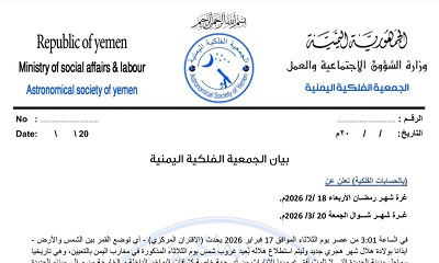 أعلنت الجمعية الفلكية اليمنية، في بيان رسمي صادر عنها، أن يوم الأربعاء 18 فبراير 2026م هو غرة شهر رمضان المبارك للعام الهجري 1447هـ، وذلك استنادًا إلى الحسابات الفلكية الدقيقة المتعلقة برؤية الهلال.